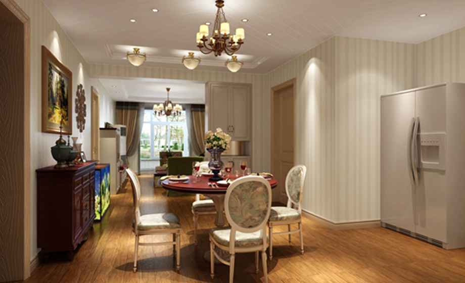 客廳地面采用木地板,淺色涂料。餐廳吊頂用紙面石膏板襯底剔槽和