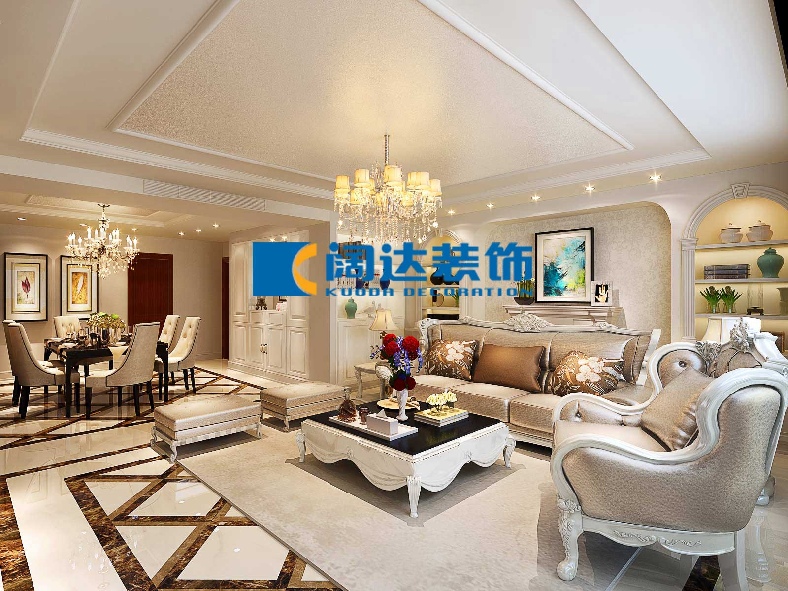 本案例采用歐式設計風格,通過整體色彩及家具的搭配營造自然、舒適、高雅的生活氛圍,此設計案例也在相當程度上表現出其居住者的品位、愛好和生活價值觀。