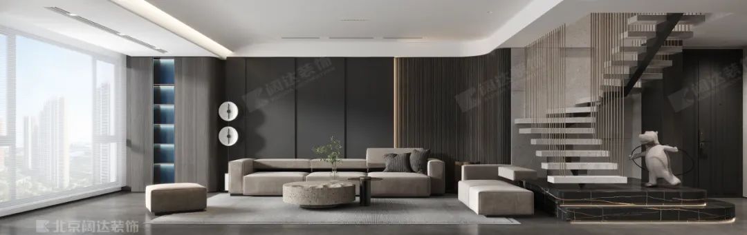 客廳以木質(zhì)和黑白灰為基調(diào),空間強(qiáng)調(diào)色彩的沉靜和造型線條的簡潔。落地窗將充盈的自然光引入室內(nèi),使客廳寬敞明亮。簡潔干凈的塊面和線條營造出空間的溫暖與愜意。