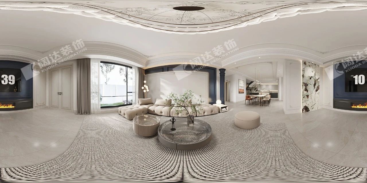 在延續了客餐廳整體基調外,會客區主背景別具一格的潘多拉石材與法式線條相結合,加上右邊漸變亞克力裝飾柜的跳躍,讓整個背景在保證法式浪漫主義的同時,凸顯年輕的活力與色彩。