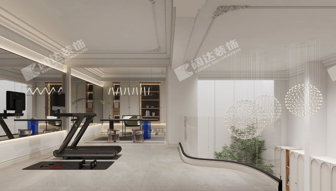 隔層區域是健身區和主人書房區域,為了在視覺上放大空間,將健身區的鏡子延伸穿插到書房里面,用氛圍燈進行鏈接,看似單獨的兩個空間,卻又有著緊密的聯系。