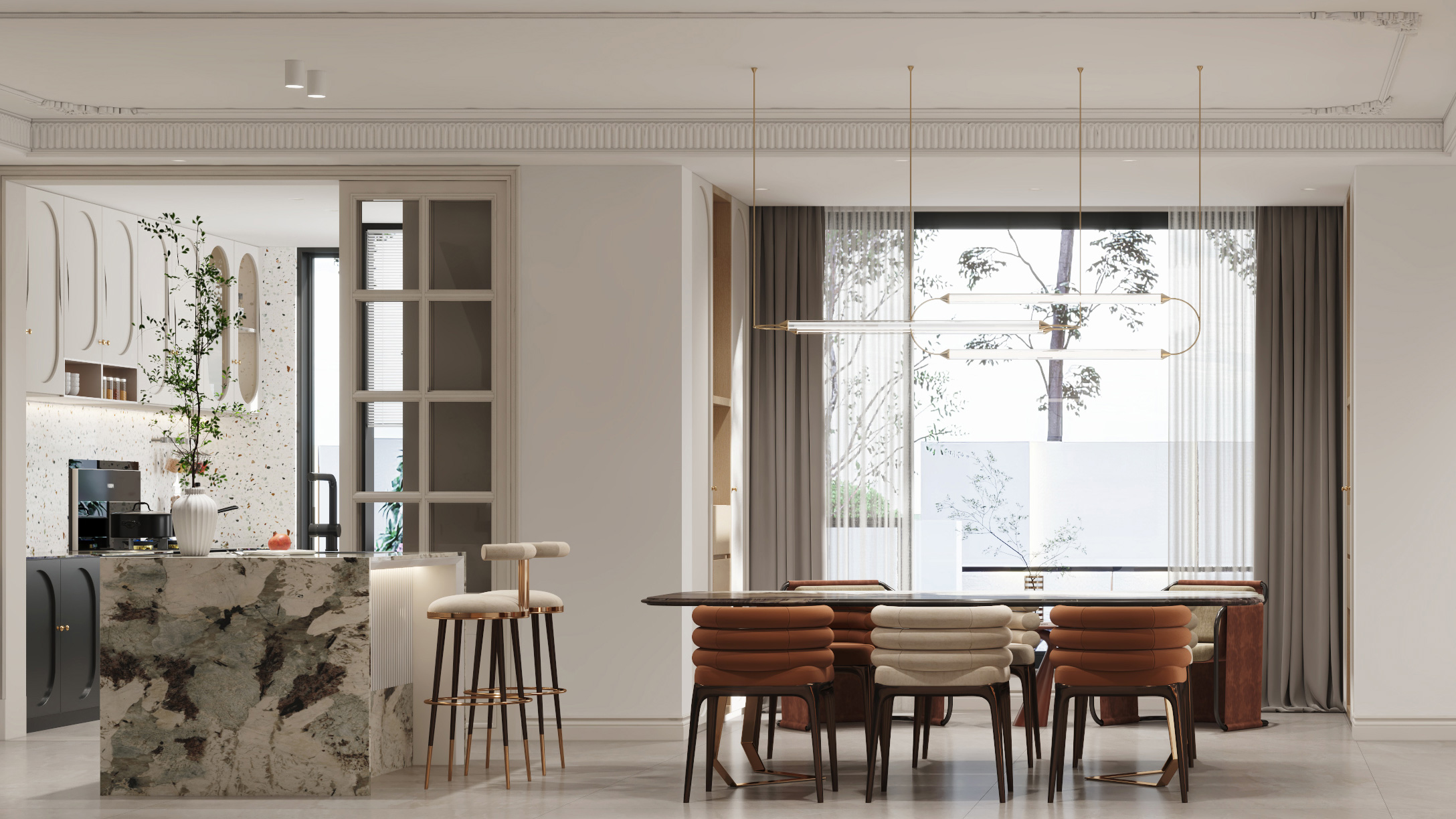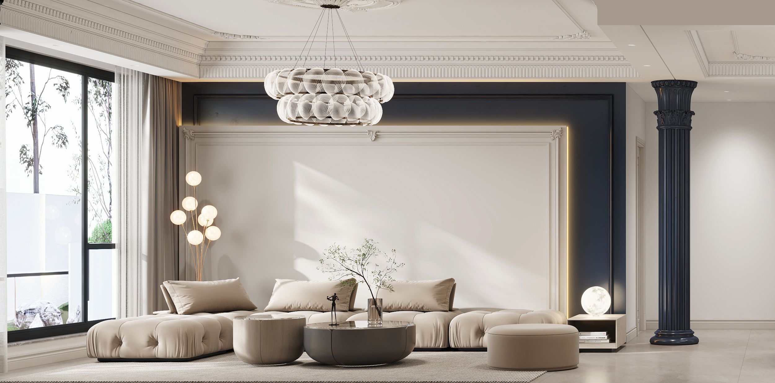 頂面側光,使優美的石膏線條更具層次感,保證了視覺上的明凈簡約,空間采光更通透明亮。