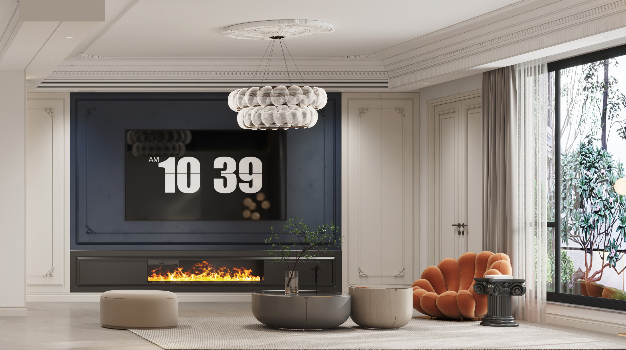 簡潔有品質的現代茶幾、沙發融合法式設計的浪漫情懷,色彩層次與藝術韻律相互映襯,使家里的每個角落都美得柔和而高級。