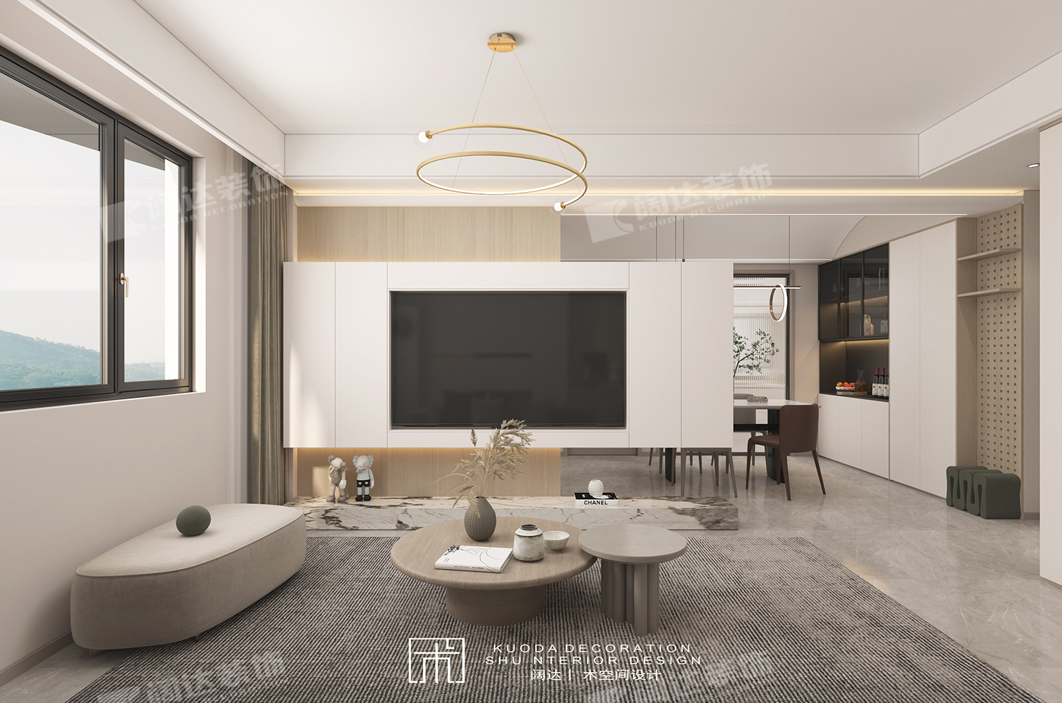 通過改變臥室門方向,延長了客廳墻面,正好將沙發由南朝北放置于此,對面電視背景做懸空處理,將光線引入餐廳,整個區域采光、動線和比例較為適宜。
